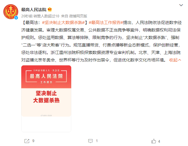 3月7日 消息:据最高人民法院消息,最高法工作报告提出,人民法院依法促进数字经济健康发展。审理权属交易、公共数据不正当竞争等案件,明确数据权利司法保护规则。