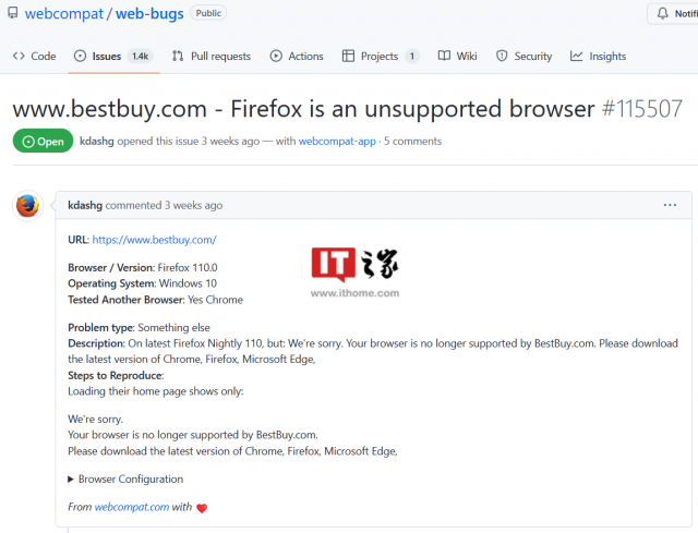 1 月 3 日消息,根据用户向 Mozilla 的 Bug 反馈,Firefox 110 火狐浏览器遇到了一个奇怪的问题,在访问 BestBuy.com 时显示“不再支持您的浏览器,请下载最新版本的 Chrome、Firefox、Microsoft Edge”。