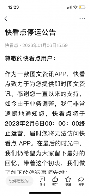作为一款图文资讯APP,快看点致力于为您提供即时图文资讯。感谢您一直以来的支持,如今由于业务调整,我们非常遗憾地通知您,快看点将于2023年2月6日00:00:00终止运营,届时您将无法访问快看点 APP。在最后的时光中,我们仍希望为大家留下最好的回忆,带着这个初衷,我们做了如下的停运事项安排∶