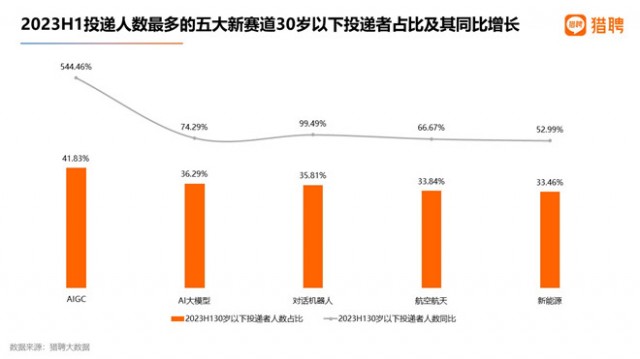 从这些新赛道的投递情况来看,2023上半年投递人数同比增长最多的五大新赛道是AIGC、对话机器人、AI大模型、航空航天、新能源,增长率分别为470.34%、81.12%、69.50%、58.08%、38.09%。