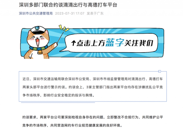 【TechWeb】8月1日消息,据深圳市公共交通管理局官方公众号消息,近日,深圳市交通运输局联合深圳市公安局、深圳市市场监督管理局对滴滴出行、高德打车两家头部平台进行警示约谈。约谈会上,3家主管部门指出两家平台均存在涉嫌扰乱公平竞争市场秩序,影响行业安全稳定的投诉与舆情。