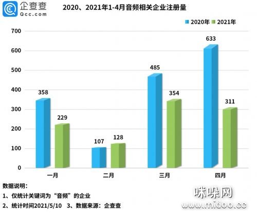 企查查数据显示,今年前4月共新增1022家音频相关企业,同比下降35%。其中一月注册量229家,同比下降36%。二月注册量为128家,同比增长19.6%。三、四月注册量分别为354家、311家,均呈同比下降趋势。
