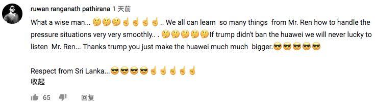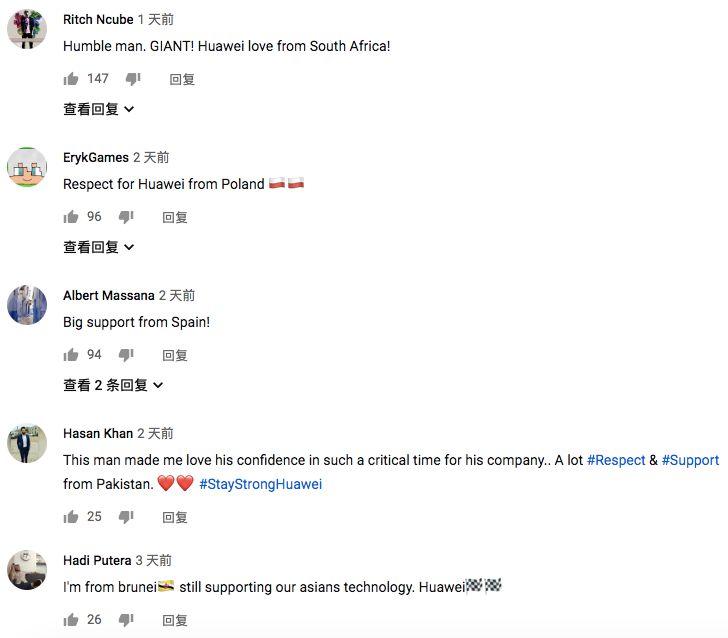 不光是这条视频下有无数支持任正非支持华为的留言,在其他专访任正非的视频下,也有很多外国网友为他和华为加油鼓劲。