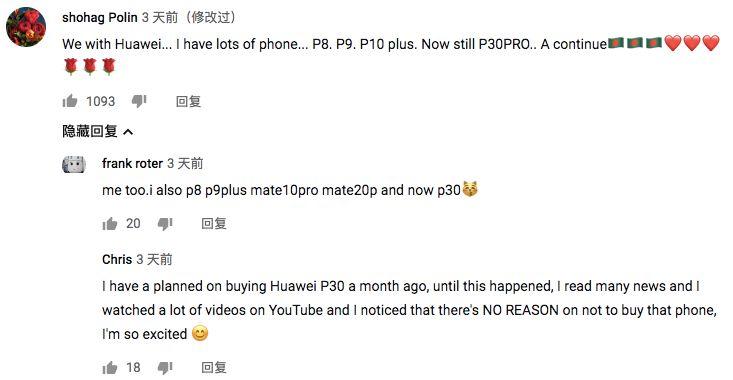 C: 我一个月前打算买华为P30来着,结果出了这档子事。我看了不少新闻,在油管上看到很多视频,然后发现根本没有理由不买这手机啊。好开心。