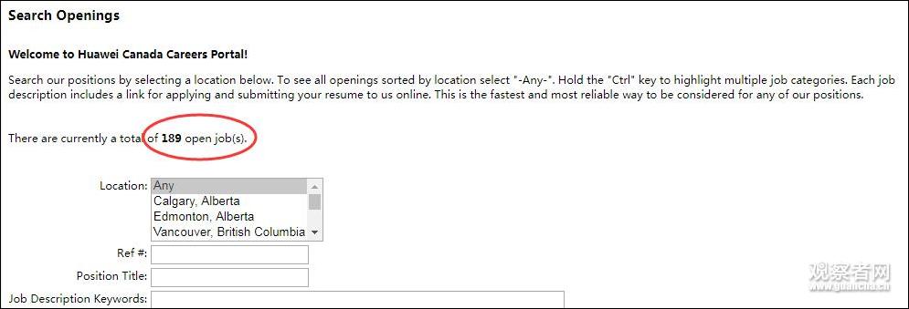 观察者网发现,目前加拿大华为公司的官网招聘上,有189个岗位可供申请,以“软件工程师”、“AI研发研究员”居多。这189个岗位中,还包括2个专利法相关法务岗位。