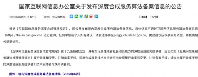 同时,国家互联网信息办公室关于发布深度合成服务算法备案信息的公告中表示,《互联网信息服务深度合成管理规定》第十九条明确规定,具有舆论属性或者社会动员能力的深度合成服务提供者,应当按照《互联网信息服务算法推荐管理规定》履行备案和变更、注销备案手续。深度合成服务技术支持者应当参照履行备案和变更、注销备案手续。请尚未履行备案手续的深度合成服务提供者和技术支持者尽快申请备案。