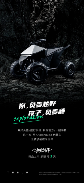 【TechWeb】7月11日消息,据特斯拉官方微博透露,特斯拉Cyberquad玩具车即将在国内上市,该款车型主要针对儿童设计,是一款四轮全地形车(ATV)。