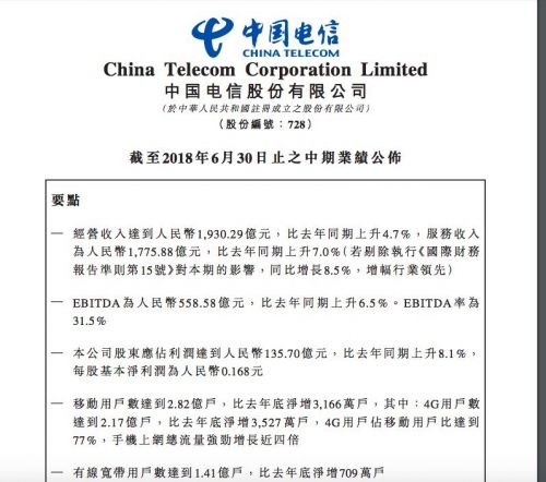 【TechWeb】8月20日消息,中国电信今天对外发布中期业绩报告,数据显示,截至2018年6月30日止6个月,中国电信实现经营收入达人民币1,930.29亿元,同比上升4.7%。其中,服务收入为人民币1,775.88亿元,同比上升7.0%。公司股东应占利润达到人民币135.70亿元,同比上升8.1%。