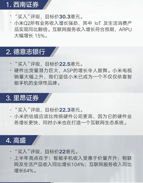 在小米集团公布该季财报后,各大券商机构也随之更新其研究报告,并纷纷给出了“买入”、“增持”的评级。其中,摩根大通、高盛等8家机构均继续保持20港元及以上目标价,而西南证券维持最高目标价30.3港元。具体信息如下: