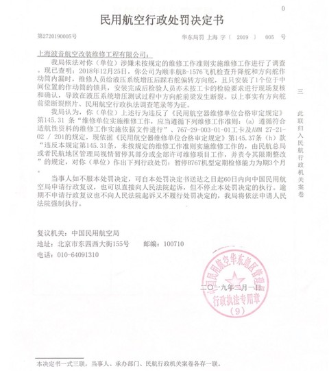 民航华东地区管理局对上海波音航空改装维修工程有限公司作出暂停B767机型定期检修能力为期3个月的行政处罚。