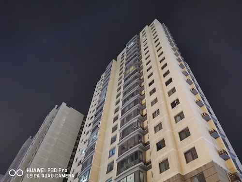 再来看看没有光源的夜景,从下面这张照片可以看出,建筑的灯光已经全部熄灭 ,所依靠的光线只有路灯的漫反射,P30 Pro依旧能够拍出完美的照片。