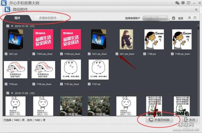 第六步、根据系统区分的时间,对照需要查看的微信无法加载的图片产生的时间,找到指定的图片,勾选之后点击【恢复到电脑】就可以将该图片导出到电脑本地进行保存了。